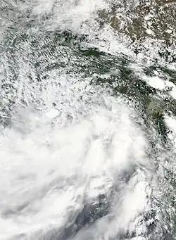 On 15 July, the JTWC started monitoring a disturbance west of Jafrabad, Gujarat, and it was unofficially designated as Invest 96A.[54] The disturbance substantially deepened, early on the next day, which prompted JTWC to upgrade it chance of formation to medium.[55] At 03:00 UTC of the same day, the IMD noted the disturbance and upgraded it to a tropical depression, becoming the first tropical depression of the season in the Arabian Sea.[56] It peaked as a depression, with maximum sustained wind speed of 25 kn (45 km/h; 30 mph) and a minimum barometric pressure of 992 hPa (29.29 inHg) after its initial stage of formation.[56] However, the system suffered from dry air intrusions as it moved away from the Indian coast.[57] By 18:00 UTC, the JTWC ceased tracking Invest 96A,[58] and on 18 July, the IMD issued its last warning, citing its weakening to a remnant low.[59]