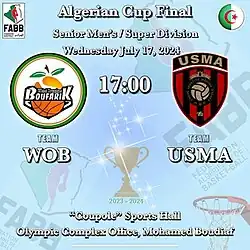 The 2023–24 Algerian Basketball Cup was the 55th edition of the Algerian Basketball Cup. Consistent information from the Algerian Basketball Federation indicating the possibility of canceling the Algerian Cup final for the 2023-24 season.[1] This situation comes following the refusal of the authorities of the Wilaya of Jijel to host the final between WO Boufarik and USM Alger despite the visit of the president of the FABB and the national competitions commission where an agreement was given previously by local authorities.[1] As such, the Federation, which intends to reschedule this final in Algiers, has been informed that La Coupole d'Alger Arena is requisitioned for another extra-sporting event (cosmetic products exhibition) for the day of July 13.[1]