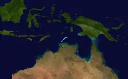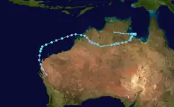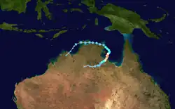 On 7 January, the BoM noted the possibility of a tropical low forming near the north Kimberley, as a monsoon trough was expected to develop along the Top End. It was predesignated as 03U.[54] This came to fruition 4 days later, when the BoM reported that it was developing over the southern Joseph Bonaparte Gulf within the trough.[9] As the tropical low tracked overland, the system maintained a robust outflow channel in the upper troposphere.[55] The BoM continued to monitor the low as it moved slowly southeast,[56] then turning west towards Western Australia by 20 January,[57] until they determined that it would not develop into a tropical cyclone on 23 January.[58][59]