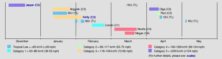 After a significant lull in activity, Tropical Cyclone Anggrek and Tropical Low 03U formed on 10 and 11 January respectively,[8][9] with the latter dissipating on 23 January.[10] The next day, Cyclone Kirrily formed.[11] Tropical Low 06U formed on 30 January, dancing out of basin the next day and waltzing back in on 5 February.[1][12] Tropical Cyclone Lincoln formed on 16 February and made landfall on the Gulf of Carpentaria coast.[13] Severe Tropical Cyclone Neville formed north of the Cocos Islands[14] on 1 March and left the basin 20 days later.[15] Severe Tropical Cyclone Megan formed on 13 March from a tropical low over the coast of the Gulf of Carpentaria.[16] Short-lived Tropical Low 10U formed and weakened within the same day of 14 March.[17] Severe Tropical Cyclone Olga formed within a monsoon trough south of Sumba[18][19] on 4 April. Tropical Cyclone Paul formed 5 days later over the Louisiade Archipelago.[20] Tropical Low 12U formed on 12 April and remained traceable.[21]