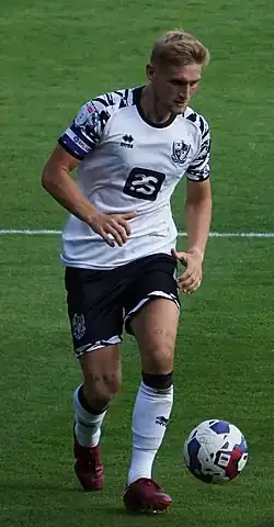 Port Vale's first signing of the summer was versatile midfielder Tom Sang, who would join on a free transfer from Cardiff City on 1 July, two days after his 24th birthday.[4] A change in the goalkeeping department was then announced, as 30 year-old Connor Ripley joined from Morecambe, whilst Aidan Stone was permitted to leave for League Two side Notts County on a free transfer.[5][6] Alex Iacovitti, a Scottish 25-year-old defender from Ross County, 28-year-old Plymouth Argyle midfielder Conor Grant, and 34-year-old former Canada international goalkeeper Jayson Leutwiler all arrived before the official start of the season on 1 July.[7][8][9] On 2 July, 24-year-old right-back Mitch Clark signed with the club for a record fourth spell following "lengthy negotiations".[10] Ethan Chislett, a 24-year-old South African midfielder from AFC Wimbledon, and 31-year-old Salford City midfielder Jason Lowe were announced the following day.[11][12] The first loanee to arrive was 22-year-old Crystal Palace defender Kofi Balmer, who had played for manager Andy Crosby in the Northern Ireland under-21 team.[13] A second loanee soon followed in 19-year-old central midfielder Ollie Arblaster from Sheffield United.[14] Crosby appointed a new club captain in 27-year-old stalwart Nathan Smith, with Funso Ojo as vice-captain.[15] In desperate need of a striker, Crosby signed 20 year-old Josh Thomas on a season-long loan from Swansea City, who was yet to make his professional debut but had impressed during pre-season friendlies with his parent club.[16] Two days before the season opener, defender Mal Benning joined Shrewsbury Town on a free transfer.[17] The following day, striker James Wilson, who had left the Vale on 14 May, returned to sign a six-month contract.[18]