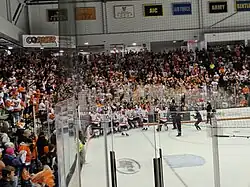 After that inauspicious start, the team hosted Notre Dame at the Blue Cross Arena for their homecoming game. In front of a sellout crowd of over 10,000, RIT played a staunch defensive game and shutout the Irish. While the team couldn't help itself and took 27 minutes in penalties, they were able to hold off a lackluster power play and earn a very important win for the team's postseason hopes. Tommy Scarfone was the hero of the match, stopping all 36 shots that were sent his way. After their first win, the team began its conference schedule early and quickly jumped to the top of the Atlantic Hockey standings. Scarfone continued to play well in goal and was named the national goaltender of the month for October by the Hockey Commissioners Association.[3] He was not the only reason for the Tigers' success, however, as the team had raised its already potent offense to another level. While several of last year's point leaders got back into the swing of things swiftly, the team received a boots from the return of Elijah Gonsalves after he was forced to sit out two weeks with a lower body injury. The team was also beginning to see two of its new arrivals contribute offensively with Matthew Wilde and Tyler Fukakusa getting up to speed by Thanksgiving.