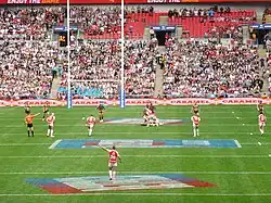 Hull Kingston Rovers emerged as runners-up at Wembley Stadium against the Leigh Leopards, who won the match in extra time on golden point rules with a drop goal by Lachlan Lam.[40] The 2023 final was the first time a Challenge Cup final had been held without either Leeds Rhinos, Wigan Warriors, Warrington Wolves or St Helens participating since 1986.[41]