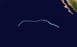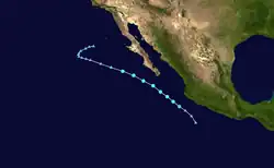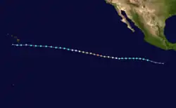Forecasts at the outset of the 2023 season predicted busier-than-normal tropical cyclone activity in the eastern Pacific basin, largely due to El Niño.[6] However, no tropical cyclones developed until June 27, when Hurricane Adrian initially formed, becoming the latest first-named Eastern Pacific tropical storm since Tropical Storm Agatha in 2016.[7] In July, Hurricane Calvin became the season's first major hurricane, later passing just south of the Big Island of Hawaii as a tropical storm, bringing widespread rainfall to the area and neighboring Maui. In August, Category 4 Hurricane Dora passed south of the Hawaiian Islands and contributed to strong gradient winds over Hawaii, which in turn helped fan the flames of multiple devastating wildfires.[3] Later that month, Hurricane Hilary made landfall as a tropical storm in Baja California, later bringing torrential rainfall and gusty winds to the Southwestern United States. In early September, Hurricane Jova, the first Category 5 hurricane in the basin since 2018, caused rainfall, high waves and rip currents in areas previously affected by Hilary.