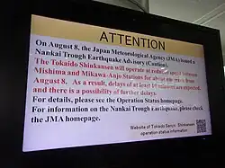 - ^ 南海トラフ地震臨時情報(巨大地震注意) [Nankai Trough Earthquake Emergency Information (Caution for a Major Earthquake)]. Japan Meteorological Agency. Retrieved 14 August 2024.