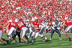 ![]() Nebraska Cornhuskers quarterback Dylan Raiola prepares for a handoff during a game against the UTEP Miners on August 31, 2024. | |