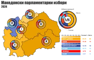 The election resulted in a landslide victory for the national conservative VMRO-DPMNE and its Your Macedonia coalition, winning 58 seats in the Sobranie, just three shy of an outright majority. Their main rivals, the incumbent pro-European SDSM and its For a European Future coalition, ended up in distant third place, winning 18 seats, their worst ever result. All other parties and coalitions that won seats include: the European Front coalition with 18 seats and the VLEN Coalition with 14 seats (both representing national minorities), the left-wing nationalist The Left with six seats, as well as the left-wing populist For Our Macedonia Movement (ZNAM) with six seats.[10] Turnout was 55%. While initially allocated 19 and 13 seats respectively, following repollings in Ohrid, Struga and other areas on 22 May 2024 led to the European Front losing one seat in favor of the VLEN coalition allowing SDSM and its For a European Future coalition to become the second biggest group in the Assembly.[11]