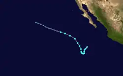 On August 18, the NHC began observation of a system well to the south of the coast of Mexico with potential for some slow development.[78] Four days later, on August 22, a broad area of low pressure producing disorganized showers and thunderstorms primarily west of its center formed far south of the southern tip of the Baja California peninsula.[79] By the afternoon of August 25, the tropical disturbance had developed a well-defined surface circulation with 45 mph (75 km/h) maximum sustained winds, and was upgraded to Tropical Storm Hector.[80] Northerly wind shear and passage over cool SSTs, left in the wake of Hurricane Gilma, prevented Hector from strengthening much.[81] Hector strengthened slightly on August 26 and reached its peak intensity, with maximum sustained winds of 60 mph (95 km/h) and minimum central pressure of 998 mbar (29.5 inHg).[82] Continued unfavorable environmental conditions caused Hector to gradually become less organized thereafter, with moderate wind shear exposing Hector's low-level circulation center.[83][84] Hector continued to weaken, and the storm opened into a trough early on August 29.[85]