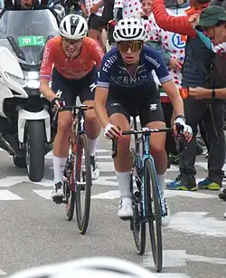 The stage started with a breakaway of 22 riders, including Ghekiere in the polka-dot jersey. On the Col de Tamié, Ghekiere took maximum QoM points, increasing her lead in the mountains classification over Pieterse.[59][60] The lead of the breakaway fell from 2 min 30 s to under 90 seconds as they approached the bottom of the Col du Glandon. The peloton pushed up the climb at a high pace, slowly reducing to a group of GC favourites. With 2.5 kilometres (1.6 mi) of the climb remaining, Vollering attacked from this group – with only Rooijakkers able to follow. Niewiadoma stayed with Lucinda Brand (Lidl–Trek), Évita Muzic (FDJ–Suez) and Gaia Realini (Lidl–Trek), as Vollering and Rooijakkers quickly built up a lead of around a minute by the top of the Glandon. After a 20-kilometre (12 mi) descent into the valley, the pair had a lead of 90 seconds – putting them in the virtual yellow jersey.[59][60] On the flat valley road, Niewiadoma worked with Brand, Realini and Muzic to reduce the gap to the pair ahead. At the foot of Alpe d'Huez, with 13.8 kilometres (8.6 mi) of the stage remaining, the gap had fallen to 45 seconds. On the climb, Vollering and Rooijakkers pushed hard to increase the gap to over a minute – the pair needed a winning margin of around 1 min 10 s to take the yellow jersey. However, Niewiadoma worked with Muzic and Realini to stabilise the gap, with 5 kilometres (3.1 mi) of the climb remaining.[59][60] On the final part of the climb Vollering began to tire, with the gap to Niewiadoma falling to around 50 seconds. In the final metres of the stage, Vollering accelerated past Rooijakkers to take her second stage win of the Tour, taking 10 seconds in time bonuses for winning the stage. Around a minute later, Niewiadoma and Muzic crossed the finish line – with Niewiadoma therefore winning the yellow jersey by a margin of four seconds, the smallest margin of victory in Tour de France history.[59][61]