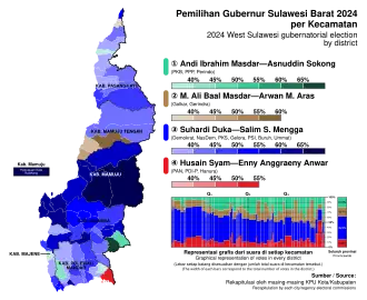 The 2024 West Sulawesi gubernatorial election was held on 27 November 2024 as part of nationwide local elections to elect the governor and vice governor of West Sulawesi for a five-year term. The previous election was held in 2017. The election was won by Suhardi Duka of the Democratic Party with 46% of the vote. He defeated three other candidates, the runner up, former Polewali Mandar Regent Andi Ibrahim Masdar, received 19%. Former Governor Ali Baal Masdar placed third with 18%.