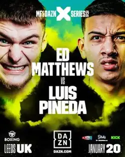 MF & DAZN: X Series 12 featured Ed Matthews vs Luis Alcaraz Pineda, a middleweight MF–professional crossover boxing match contested between English TikToker Ed Matthews and Mexican professional boxer Luis Alcaraz Pineda, who was marketed as a mystery opponent. The bout took place on 20 January 2024 at the First Direct Arena in Leeds, England.[5] Pineda defeated Matthews via knockout in the second round.