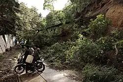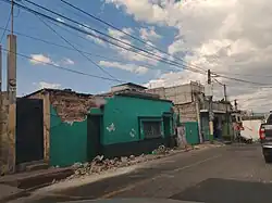 More than 2,145 homes were reportedly affected,[17] of which 201 were severely damaged and 25 were in risk of collapse. Additionally, nine health centers, 13 public buildings, 62 schools, 31 roads, a highway and a bridge were impacted.[18][19][20] At least 1,953 people were affected, of which 323 were left homeless.[19] In Amatitlán and Antigua Guatemala, several homes were damaged or destroyed and a church at Santa María de Jesús was severely damaged.[21][2] Santa María de Jesús was isolated following a landslide on the RD-SAC-01 highway.[22] Water and electricity outages also occurred.[23] In Palín, more than 300 homes, the old municipal building, and a church were damaged and a landslide occurred.[24][20] In San Vicente Pacaya, more than 300 homes were damaged[25] and the main access road to the municipality was blocked by a landslide.[26] In the capital Guatemala City, one house collapsed and a building was severely damaged.[27] A health center was damaged in Joyabaj, Quiche.[20] Some damage was also reported from the departments of Baja Verapaz and Chimaltenango.[28] Power, telephone, and internet services were disrupted in towns near the epicenter,[29] with electric services fully restored in Santa María de Jesús two days after the quake.[20] The National Hospital of Amatitlán suspended operations due to earthquake damage, while its patients were evacuated to Villa Nueva.[30] A building within the complex was subsequently recommended for demolition.[31]