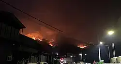 The emergency displaced at least 37,829 people[67] and necessitated the evacuation of residents from 15 villages in affected areas. This included the evacuation of 260 residents of Sancheong County to temporary shelters after their homes were destroyed by wildfires from the surrounding hillsides, the displacement of 500 individuals in Uiseong County, and dozens of residents of Gimhae.[2][4][5] A wildfire that spread in Ulju County in Ulsan, necessitated the evacuation of about 80 people.[4] Additionally, authorities closed multiple highway and railway sections in southeastern regions, including a major route connecting Ulsan and Busan, the nation's second-largest metropolitan area.[2][4] Authorities also ordered the evacuation of 2,600 inmates at the Cheongsong Prison after wildfires reached Cheongsong County from Uiseong,[68] while 800 inmates were also evacuated from Andong Prison.[69] The evacuations were the first large-scale operations of its kind conducted by the Ministry of Justice due to a natural disaster.[16]