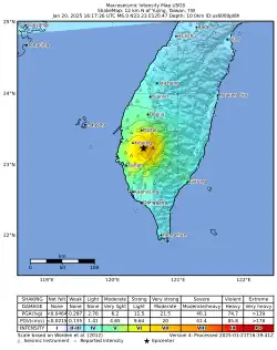 On 21 January 2025, at 00:17:26 TST (16:17 UTC on 20 January), a ML 6.4 (Mw 6.0) earthquake struck Dongshan District, Tainan City, Taiwan, near the border with Chiayi County. It was caused by reverse faulting and had a depth of 16 kilometres (9.9 miles).[1] It injured 50 people and damaged several thousand buildings across six counties and cities in the southwest of the island, mainly in Tainan. The earthquake was followed by a series of intense aftershocks, which caused additional damage in the most badly affected areas of the mainshock.