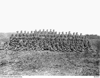 The 20th Battalion was raised in March 1915 in Liverpool, New South Wales, as part of the Australian Imperial Force (AIF). A small number of its original recruits had already served with the Australian Naval and Military Expeditionary Force in New Guinea in 1914.[3] After undertaking initial training, the battalion left Australia in June and after a further period of training in Egypt they landed at Anzac Cove on 22 August 1915 as part of the 5th Brigade, 2nd Division. They played only a minor part in the fighting during the August Offensive which was coming to a close by the time they arrived and so for the majority of time that they were at Gallipoli, the battalion was deployed in the defence of Russell's Top.[3] They remained on the peninsula until the evacuation on 20 December 1915.[3]