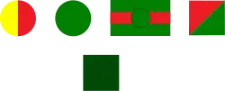 The practice of wearing battalion specific insignia (often called battle patches) in the B.E.F. began in mid 1915 with the arrival of units of Kitchener's Armies and was widespread after the Somme Battles of 1916.[73] The patches shown were worn by the division during 1917.[74] There was no overall division scheme for the battle patches, they were adopted gradually from mid 1916.[75]