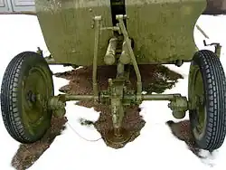 The front axle of the carriage allows for changing the direction in which the gun is going when towed, and is pivotally connected to the frame with help from a balancer. The control mechanism is also connected to this axle. Suspension for each wheel is provided via shock-absorbing springs, independent of each other. The gun can be towed from either the front or rear via coupling devices.