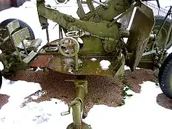 The upper part of the carriage houses the horizontal traverse mechanism, which allows for 360-degree traverse, while the lower part serves as support for the upper part. Units built from 1943 onwards also have a gun shield in place, which protects the crew from bullets and fragments. Horizontal and vertical traverse mechanisms are controlled from the right of the gun, with one revolution of the flywheel corresponding to a traverse of 7°30′ vertically, or 19°30′ horizontally.