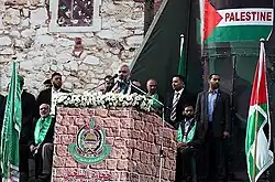 The 25th anniversary of the founding of Hamas took place on 8 December 2012. A rally involving hundreds of thousands of Palestinians was held in the Gaza Strip and various celebrations were conducted all over the Palestinian Authority.[1] Thousands of jubilant Hamas supporters openly raised green flags in the West Bank, to celebrate the Islamic organization's 25th anniversary.[2]
