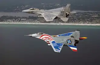 - ^ The MiG-29 (29 + 10) is flown by the commander of Luftwaffe Jagdgeschwader 73 "Steinhoff", from Laage, Germany. It is in formation with a U.S. Air Force McDonnell Douglas F-15C-33-MC Eagle (serial 82-15) over the Gulf of Mexico during a joint training exercise on 14 May 2003.