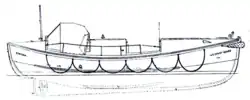 The Type "TRS" ("TR"-Simplified) motor lifeboat was designed to reduce weight and cost.[4] Visually, the Type "TRS" eliminates the bright brass hand and grab rails used with the "T" and "TR" in favor of painted white oak; in addition, there are nine self-bailing scuppers on each side of the "TRS", compared to eight on the "TR" and seven on the "T", and the sailing rig has been removed entirely.[4] Below the waterline, the prewar "TRS" boats had a simplified open rudder and propeller arrangement and internally, they continued with gasoline Sterling Petrel or Kermath Sea Farer engines; starting in 1946, new "TRS" boats were built with Buda-Lanova Model 6 DTMR-486 and Detroit Diesel 4-71 diesel engines instead.[4] The first boat was completed in early 1937 at the Curtis Bay Yard and assigned hull number 4963.[4] Although Coast Guard production ended in 1956, one additional Type "TRS" was built for the United States Navy in 1959.[4]