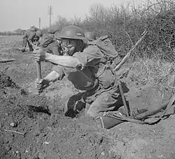3. ^ Having entered military service, a recruit was assigned to the General Service Corps. They would then undertake six weeks training at a Primary Training Centre and take aptitude and intelligence tests. The recruit would then be posted to a Corps Training Centre specialising in the arm of the service they were joining. For those who would be joining the infantry, corps training involved a further sixteen week course. For more specialised roles, such as signallers, it could be up to thirty weeks.[49]