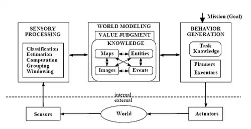 Sensory processing performs the functions of windowing, grouping, computation, estimation, and classification on input from sensors. World modeling maintains knowledge in the form of images, maps, entities, and events with states, attributes, and values. Relationships between images, maps, entities, and events are defined by pointers. These relationships include class membership, ontologies, situations, and inheritance. Value judgment provides criteria for decision making. Behavior generation is responsible for planning and execution of behaviors.[5]