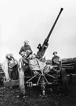 The Official History records that the AA artillery in Tobruk was 'incessantly in action against attacks of all kinds, from all heights, but especially by dive-bombers'.[34] The LAA gunners needed quick reactions to deal with low-level fighter attacks and dive-bombers. The regimental historian notes that these Stuka attacks concentrated on gun positions, which was a serious threat to HAA sites, whose instruments could not cope with the rapid height changes. The gunners devised a tactic of opening fire with short Fuzes just before the dive started, to force the pilots to fly through a ring of bursts. The battery cooks, drivers and clerks then joined in, firing machine-guns and captured 20mm Breda guns. This aggressive method was known as 'Porcupine', and was so effective that the Luftwaffe changed to high-level bombing, where the GL radar could direct concentrations. The harbour could not be completely defended against air attack by day, but was always usable by night. Aircraft attempting to lay parachute mines in the approaches were usually driven off by a low-level concentration of all available guns into a searchlight-illuminated target area. The searchlights were only switched on once the GL radar had located the target.[30][33]