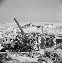 By the beginning of May, First Army was ready for its final assault on Tunis, Operation Vulcan. The AA plan or 'Vulcan' was straightforward: 52 AA Bde would hold three HAA and three LAA regiments, a S/L troop and a Z battery of rocket-launchers, all on their wheels and ready to move into Tunis and Bizerte immediately behind the leading battle groups. DElayed by a German counter-attack, the assault went in on 6 May and covered 15 miles (24 km) on the first day. The leading British armoured units entered Tunis on the afternoon of 7 May while US units entered Bizerte simultaneously. After a series of conflicting reports from the cities, 52 AA Bde was called forward. In fact, neither Tunis nor Bizerte was clear of the enemy. At Bizerte the AA advance parties were shelled from outside the town, and two batteries of 29th LAA Rgt had to be employed as infantry to flush out resistance.[44][45] After Operation Vulcan, 52 AA Bde deployed the following forces:[46]