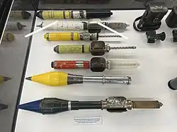 The 89 millimetre HEAT grenade weighs 2.3 kg, and is capable of penetrating 300 millimetres of RHA[2] +/- 40 millimetres. The fuse is able to function at as small as a 20 degree angle of impact.[2] The longest recommendable distance for stationary armour targets is 300 metres and to moving targets 200 metres.[2] 55 millimetre fragmentation[2] and incendiary WP grenades[4] as well as illumination rounds[4] and 55 millimetre solid training ammunition[2] were also available. The fragmentation and training ammunition weighed also 2.3 kg, and had the same 160 m/s muzzle velocity as the HEAT grenade.[2] If capped, the fragmentation grenade can penetrate obstacles such as light doors, bushes and windows before exploding. These can be shot up to 700 metres against stationary targets.[2] A rifle calibre practice barrel chambered in 7.62×54mmR could be installed inside the launching tube.