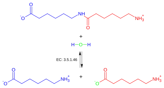 In enzymology, a 6-aminohexanoate-dimer hydrolase (EC 3.5.1.46) is an enzyme that catalyzes the chemical reaction N-(6-aminohexanoyl)-6-aminohexanoate + H2O 2 6-aminohexanoate. Thus, the two substrates of this enzyme are N-(6-aminohexanoyl)-6-aminohexanoate and H2O, whereas its product is two molecules of 6-aminohexanoate.