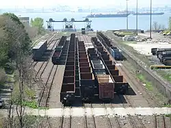 In 1981 the 65th Street Yard was purchased by the City and State of New York, which paid $2.5 million for the 24-acre (9.7 ha) site,[4] and the transfer bridges were rebuilt in 1999 at a cost of $20 million.[5][6] The new transfer bridges appear to be a simplified design: single two track span with no apron, overhead gantry, counterbalanced with electrically operated span hoist. The design appears to be a variant of the type seen on the West Coast and possibly an improvement on the design of the transfer bridge located at the 207th Street Yard in Manhattan. However these two new transfer bridges had remained unused for car float operations since the New York Cross Harbor Railroad, the successor of New York Dock Railway, abandoned plans to move its operation from Bush Terminal at 50th Street to the 65th Street Yard due to financial disputes between the city and the Railroad.