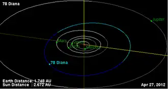 78 Diana is a large and dark main-belt asteroid. It was discovered by German astronomer Robert Luther on March 15, 1863,[6] and named after Diana, Roman goddess of the hunt. The asteroid is orbiting the Sun at a distance of 2.620 AU with a period of 4.24 years and an eccentricity (ovalness) of 0.207. The orbital plane is tilted at an angle of 8.688° relative to the plane of the ecliptic.[2] Its composition is carbonaceous and primitive.