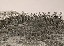On 4 May, the division captured the crown jewels of Hungary in Mattsee, Austria.[8] At the end of the war, the division was securing the left flank of the XV Corps. After processing German prisoners of war, it was redeployed to the United States, the 14,289 officers and men arriving in New York aboard four Navy transports[5] 17 June 1945. The division trained briefly at Camp Gruber, Oklahoma, 21 June – 11 August 1945; and then left San Francisco, 24 August 1945, for the Philippines. The 86th Division was aboard ship in Leyte harbor when the Japanese surrendered. After landing on Luzon the unit was dispersed throughout the Island, some to Marikina, some to other locations. A few were assigned to Corregidor Island to guard Japanese prisoners of war. While Japan formally had surrendered on 2 September 1945, division soldiers still sometimes had to face Japanese soldiers who had refused to surrender as well as Huks (Hukbalahap guerrillas). According to one account, as late as October 1946 the "straggler menace was still there" as 77 Japanese prisoners were captured. A division officer (Lt. Col. A.L. Hugins) also "was fired on while in convoy near Angeles" in the same month.[9]