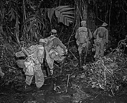 An advance party of the 93rd Infantry Division arrived at Guadalcanal on 29 January 1944. The rest of the division landed between 6 February and 5 March, one regiment disembarking at the Russell Islands on 7 February. The bulk of the division engaged in training, labor and security duties on Guadalcanal and the Treasury Islands from 7 June and both Hollandia Dutch New Guinea from 30 October. Component units performed similar duties on Finschhafen from 12 October 1944 to 31 March 1945, on Los Negros from 29 September 1944 to 16 March 1945, and on Biak from 10 October 1944 to 1 October 1945. The division's combat elements moved to Bougainville Island on 28 March 1944, and were attached to the Americal Division on the 30th. On that date they entered combat, assisting in attacks on the enemy perimeter. These elements, including the 25th RCT, reconnoitered across the Laruma River on 2 April, and in the Torokina River Valley from 7–12 April 1944. The 25th RCT operated against the Japanese along the Kuma and East-West Trails during May 1944. The combat team left for the Green Islands during May and June. The 93d Rcn. Troop, attached to the XIV Corps, remained to raid, patrol, and maintain perimeter positions. The troop began training 12 September 1944, and moved to Finschhafen on 1 November. Security patrols had scattered contacts with the enemy at Urapas from 3 to 15 January 1945, at Wardo on Biak from 6 November-22 December, and at Wari on Biak on 31 December. The security detachments at Wardo and Wari were withdrawn on 9–10 February 1945.