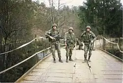 The 9th Engineer Battalion was deployed to the Balkans as part of Kosovo Force (KFOR) during Operation Joint Guardian II in June 1999 under Task Force Falcon.[5] It was the first U.S. battalion to stand up at Camp Bondsteel, Kosovo. The Companies operated in several villages which included Gnjilane, Cernica, Uglari, Podgrađe, and Stansior. Missions conducted included route reconnaissance, unexploded ordnance (UXO) reconnaissance, bunker busting, bunker building, checkpoint operations, obstacle construction, rebuilding an elementary school, and securing Pristina Airfield for President Bill Clinton's first visit to Kosovo.[6] Reported accomplishments included six cordon & search missions, ten obstacle emplacement missions, three obstacle repair missions, 189 Explosive Ordnance Disposal (EOD) incident responses, ten post blast analyses, eight vertical construction projects, over 40 kilometers of road improvement, donated over 100 boxes of toys to three sponsored schools, and over 200 escort missions.[7] The battalion returned to Schweinfurt in December 1999, and returned for a second tour in Kosovo from May to November 2002. In August and September 2003, Alpha Company deployed to Bosnia in support of Task Force 1–18's Dynamic Response Exercise.