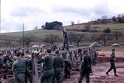 A Co builds a Bailey bridge during training near Aschaffenburg, 1966.