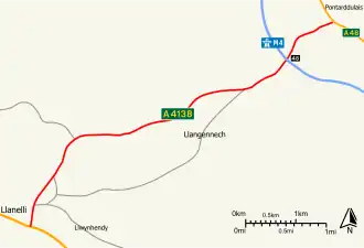 The A4138 is a main road in Carmarthenshire, Wales, connecting Pontarddulais with Llanelli. Running in a northeast to southwest direction, the road connects with M4 junction 48.[1] Northeast of the motorway, the road is classified as a non-primary route, while southwest of the motorway, the road is classified as a primary route. In both instances, the road is operated by Carmarthenshire County Council.