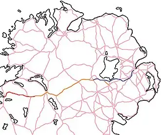 The route of the A4 in orange from Portadown (County Armagh) to Belcoo (County Fermanagh). The Northern Irish M1 is in blue, and the N16 is in red.
