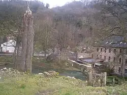 Former mill viewed from the footpath below Slinter Wood. The Via Gellia road is behind the pond and was used to transport lead from the mines above Bonsall to the smelter and canal wharf at Cromford.