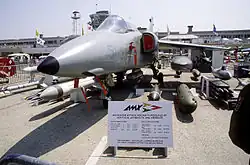 Various munitions could be mounted on the one centerline and four under-wing hardpoints, including bombs, missiles and rockets; payloads of up to 900 kg (2,000 lb) may be carried upon the centerline and the two innermost under-wing pylons, while the outer pylons can carry up to 500 kg (1,000 lb).[9] All four of the under-wing hardpoints are plumbed for drop tanks to extend the aircraft's range, Italian aircraft are also fitted with a fixed aerial refueling probe.[12] Optical reconnaissance pods can be carried externally on the centerline hardpoint.[7] Wingtip rails are provided for infrared guided air-to-air missiles such as the AIM-9 Sidewinder and MAA-1 Piranha. Italian aircraft are fitted with a M61 Vulcan 20 mm rotary cannon on the port side of the lower fuselage.[9] The United States denied the sale of the M61 to Brazil, thus its AMXs are instead fitted with two 30 mm DEFA 554 revolver cannons.[10][15]
