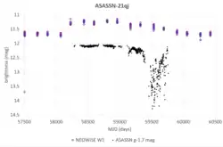 In 2021 the All-Sky Automated Survey for Supernovae reported that this star was rapidly fading. The published Astronomer's Telegram asked for follow-up observations.[6] On twitter the astronomers Dr. Matthew Kenworthy and Dr. Eric Mamajek speculated about this object and amateur astronomer Arttu Sainio made his own investigation and discovered a brightening in NEOWISE data. He then joined the discussion on social media. The star brightened 2.5 years before the dimming event. More contributions came from amateur and professional astronomers, such as spectroscopic follow-up by amateur astronomers Hamish Barker, Sean Curry and the amateur Southern Spectroscopic project Observatory Team (2SPOT) members Stéphane Charbonnel, Pascal Le Dû, Olivier Garde, Lionel Mulato and Thomas Petit. Dr. Franz-Josef Hambsch observed this object with his remote observatory ROAD and submitted his observations to AAVSO. Other observations from professional telescope include ATLAS, ALMA, LCOGT and TESS.[7][2]
