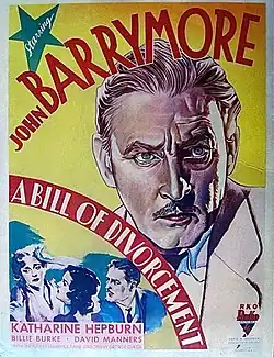 A Bill of Divorcement is a 1932 American pre-Code drama film directed by George Cukor and starring John Barrymore and Katharine Hepburn in her film debut. It is based on the 1921 British play of the same name, written by Clemence Dane as a reaction to a law passed in Britain in the early 1920s that allowed insanity as grounds for a woman to divorce her husband.[2] It was the second screen adaptation of the play; the first was a 1922 British silent film also titled A Bill of Divorcement. The film was made again in 1940 by RKO Pictures.