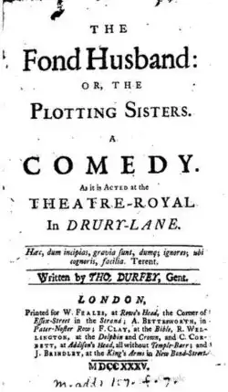 A Fond Husband; Or, The Plotting Sisters also known as The Fond Husband is a 1677 comedy play by the English writer Thomas D'Urfey. It was first staged by the Duke's Company at London's Dorset Garden Theatre with a cast that included William Smith as Rashley, Henry Harris as Ranger, James Nokes as Peregrine Bubble, Anthony Leigh as Old Fumble, Samuel Sandford as Sir Roger Petulant, Thomas Jevon as Sneak, John Richards as Spatterdash, Thomas Percival as Apothecary, Elizabeth Barry as Emillia, Rebecca Marshall as Maria and Margaret Hughes as Cordelia.[1] The published version was dedicated to the Irish statesman James Butler, Duke of Ormonde.