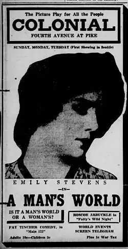"In such films as A Man's World (1918) [Emily Stevens] played the same strong modern woman character that she had created on the stage", wrote Roy Liebman.[7]