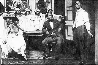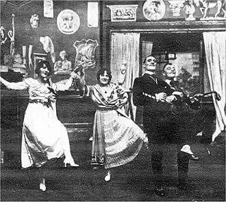 In 1896, "A Night Out", a non-musical adaptation of L'Hôtel du libre échange, opened in London and ran for 500 nights.[1] The musical adaptation, produced by George Grossmith, Jr. and Edward Laurillard followed the story of the earlier adaptation (and the French original) closely. The score was by the resident conductor of the Winter Garden Theatre, Willie Redstone, with music for additional numbers provided by the young Cole Porter as some of his earliest professional work.[2]