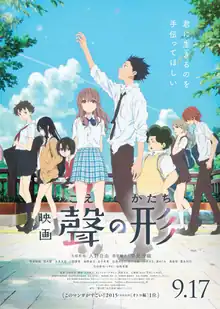 A Silent Voice (Japanese: 聲の形, Hepburn: Koe no Katachi; lit. 'Shape of Voice') is a 2016 Japanese animated drama film[4] based on the manga of the same name by Yoshitoki Ōima. The film was produced by Kyoto Animation, directed by Naoko Yamada and written by Reiko Yoshida, featuring character designs by Futoshi Nishiya and music by Kensuke Ushio.[5] Plans for an animated film adaptation were announced back in November 2014, Kyoto Animation was confirmed to produce the film in November 2015. Miyu Irino and Saori Hayami signed on as voice casting in May 2016 and the theatrical release poster and official trailer were released in July 2016.