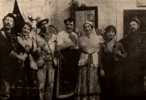 Full cast of a production by Sică Alexandrescu at Comedia Theater, c. 1937. From the left: Gheorghe Timică (Ipingescu)—Silvia Dumitrescu (Zița)—Ion Iancovescu (Rică)—Aurel Athanasescu (Chiriac)—Maria Filotti (Veta)—Leny Caler (Spiridon, in travesti)—Velimir Maximilan (Dumitrache)