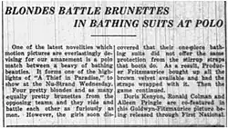 Another scene that captured the attention of critics was a polo match, organized by the hosts of a garden party, that featured a team of barefoot blondes wearing one piece bathing suits playing a team of brunettes attired in the same manner.[5]