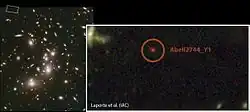 Abell 2744 Y1 is a galaxy located in the Abell 2744 galaxy cluster, 13 billion light years away in the Sculptor constellation. It is 2,300 light years in diameter, 50 times smaller than the Milky Way galaxy, but producing 10 times more stars.[1] The galaxy was discovered in July 2014 by an international team led by astronomers from the Instituto de Astrofísica de Canarias (IAC) and La Laguna University (ULL)[2] as part of the Frontier Fields program with the help of NASA’s Spitzer and Hubble Space Telescopes.
